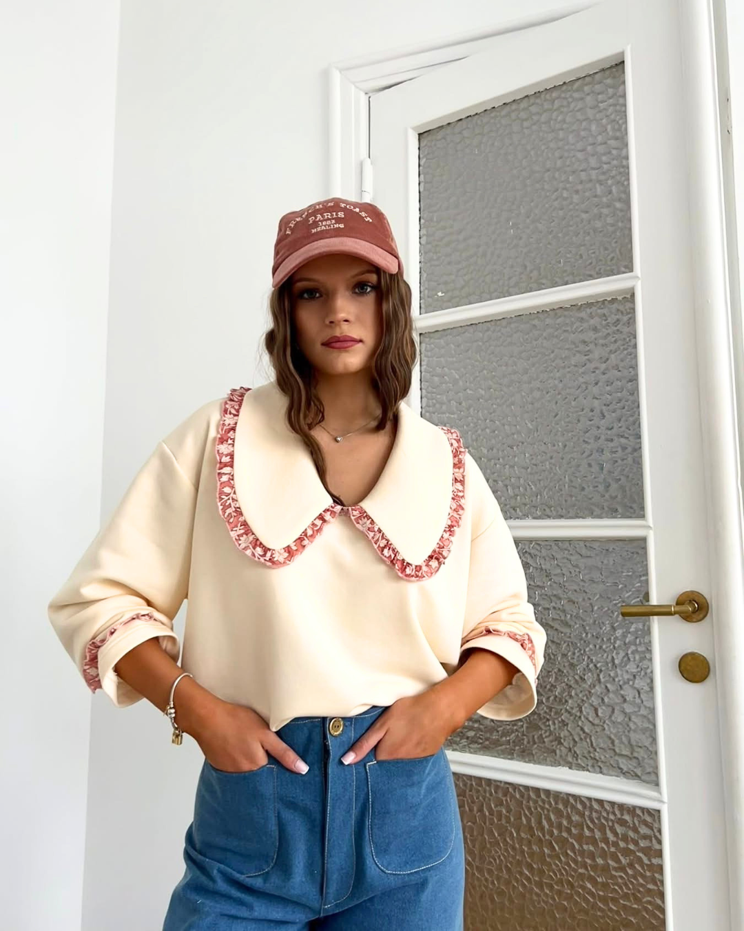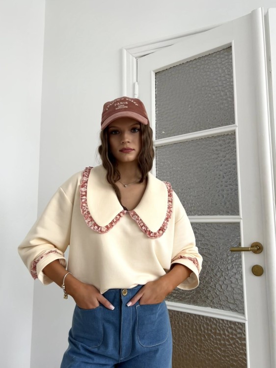Wyjątkowa bluza, która łączy komfort codziennego noszenia z eleganckim, kobiecym akcentem. Model wyróżnia się dużym ozdobnym kołnierzem wykończonym subtelną falbanką, który nadaje całości oryginalnego charakteru i sprawia, że bluza wygląda niezwykle stylowo.
