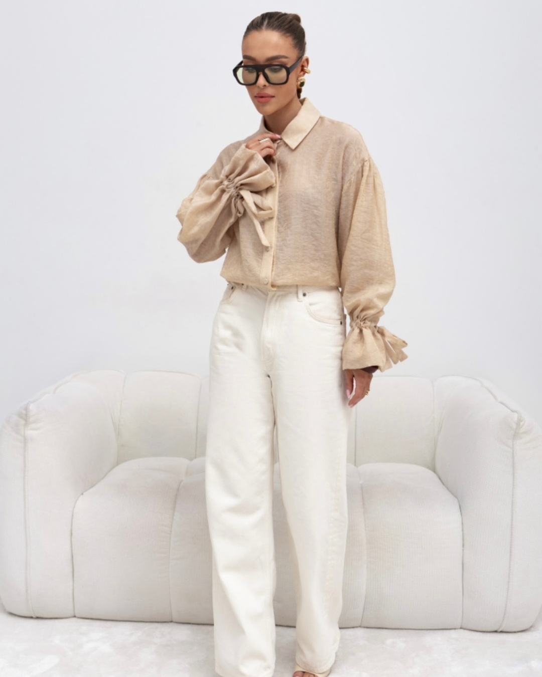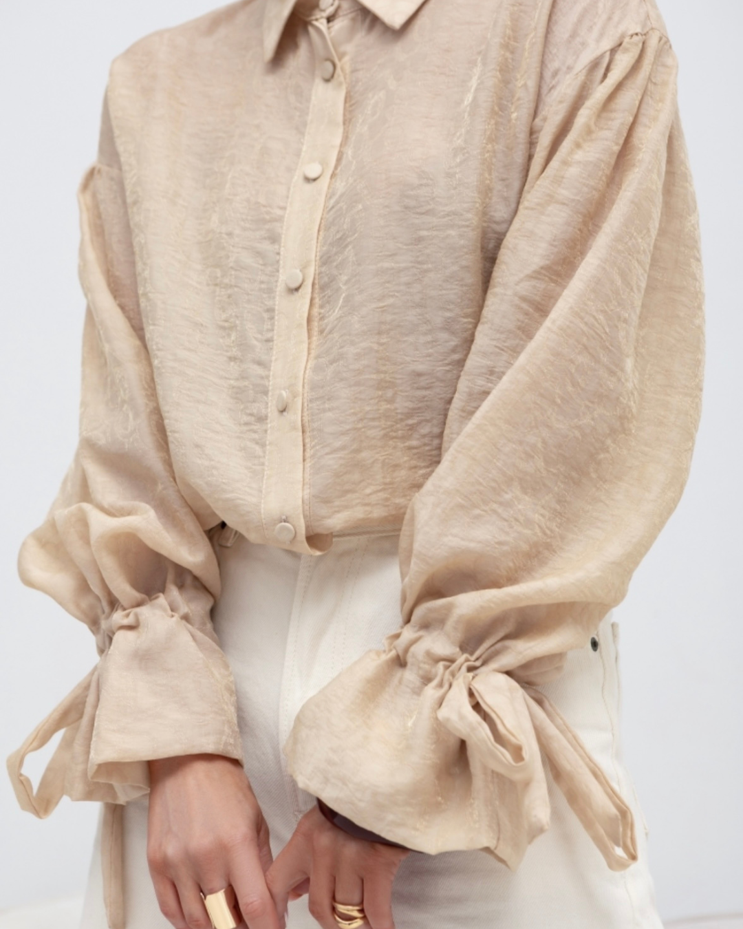 Klasyczny kołnierzyk oraz zapięcie na guziki nadają jej ponadczasowej estetyki, a obszerne rękawy zakończone wiązaniami przy mankietach dodaja uroku każdej stylizacji.