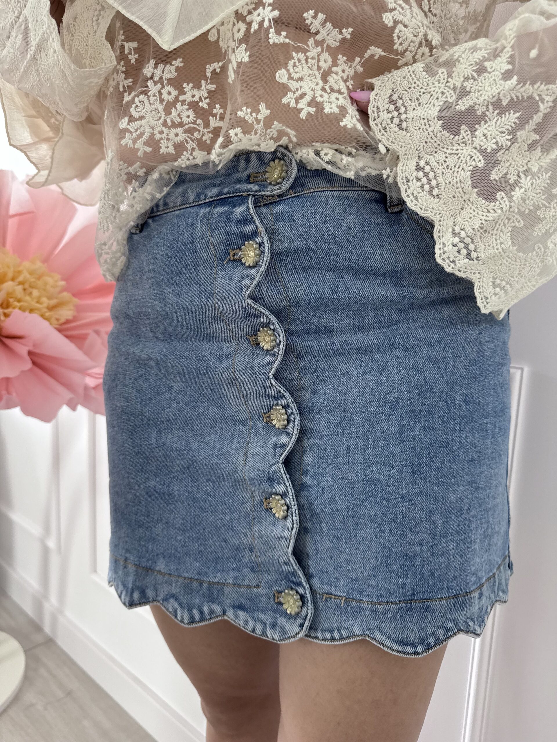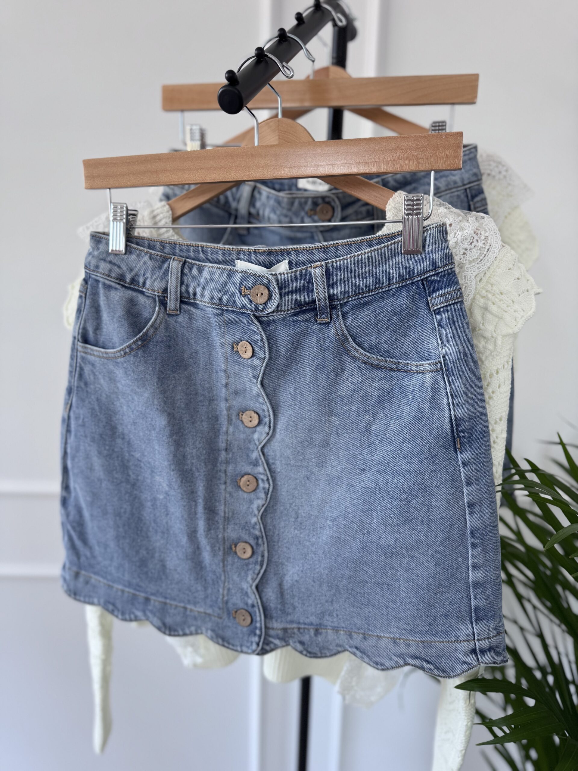 Model wyróżnia się ozdobnym zapięciem na guziki z przodu oraz subtelnym, falowanym wykończeniem, które dodaje całości lekkości i dziewczęcego uroku. Klasyczny odcień jeansu sprawia, że spódniczka jest uniwersalna i łatwa do stylizacji.