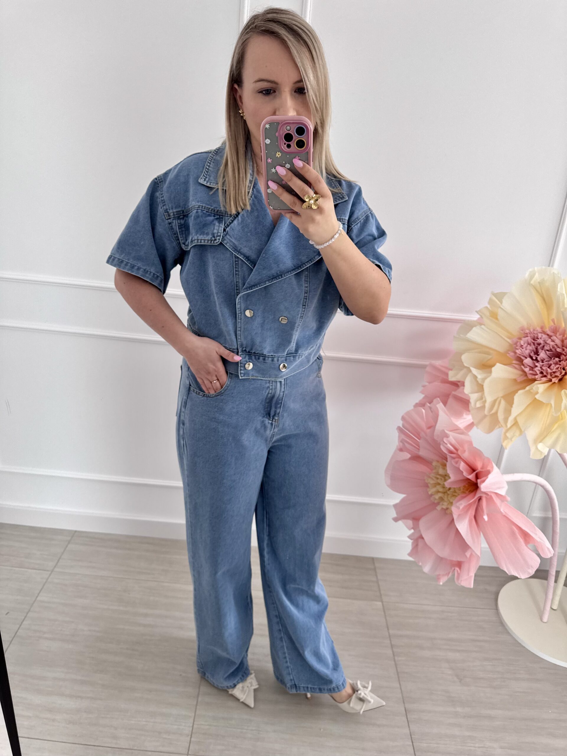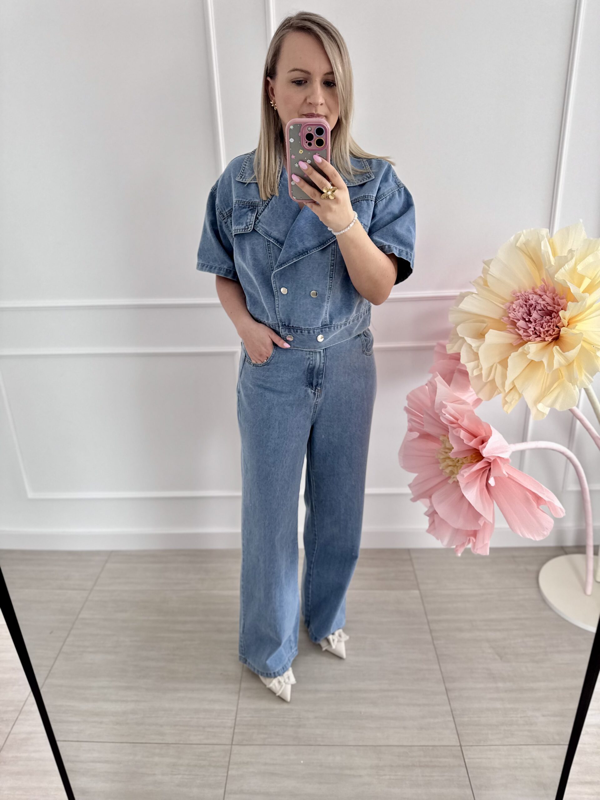 Góra zapinana na guziki z eleganckim kołnierzem pięknie podkreśla sylwetkę, a wysoki stan spodni optycznie wydłuża nogi i zapewnia komfort noszenia. Miękki, przyjemny w dotyku denim sprawia, że komplet idealnie sprawdzi się zarówno na co dzień, jak i na wyjścia.